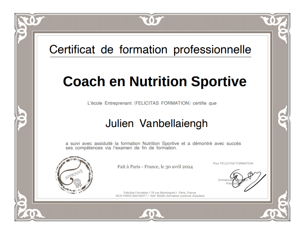 Aujourd’hui, fort de cette expérience, je suis certifié en coaching sportif et nutritionnel. J’ai eu l’honneur de participer à de nombreuses compétitions, notamment plusieurs Championnats du Monde de triathlon (WTCS). Ces défis m’ont permis de me confronter aux exigences de la performance tout en comprenant les obstacles physiques, mentaux et nutritionnels auxquels chaque athlète peut être confronté.